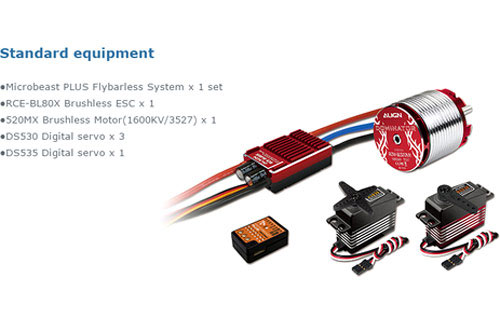T-REX 500X utilizes 470mm main blades and 520MX(1600KV/3527) motor with 20% power upgrades than the original 1600KV/3225 motor. The latest new RCE-BL80X Brushless ESC support dual BEC output from 6 ~ 8.4V providing efficient and superior power. The NEW DS530/DS535 digital servos are with extreme torque and speed response allow to support faster, more precise and accurate flight performance.